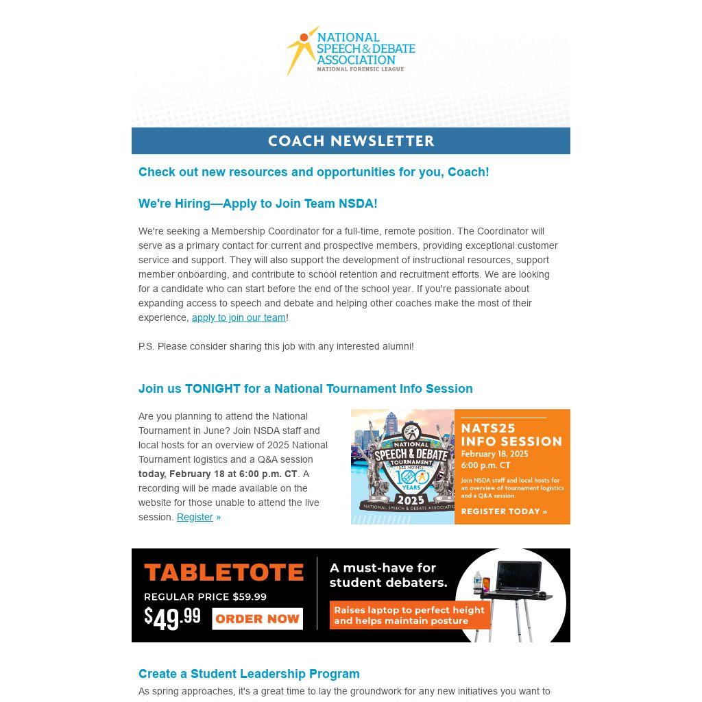 Are you planning to attend the National Tournament in June? Join NSDA staff and local hosts for an overview of 2025 National Tournament logistics and a Q&A session today, February 18 at 6:00 p.m. CT. A recording will be made available on the website for those unable to attend the live session. Register »