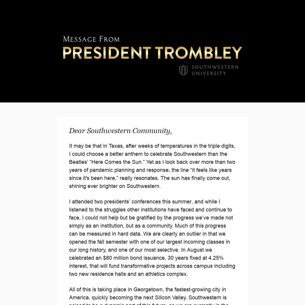 It may be that in Texas, after weeks of temperatures in the triple digits, I could choose a better anthem to celebrate Southwestern than the Beatles’ “Here Comes the Sun.” Yet as I look back over more than two years of pandemic planning and response, the line “it feels like years since it's been here,” really resonates. The sun has finally come out, shining ever brighter on Southwestern.