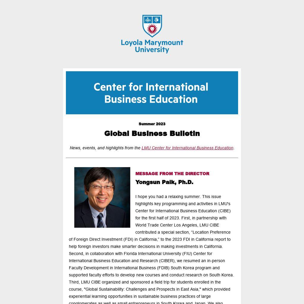 I hope you had a relaxing summer. This issue highlights key programming and activities in LMU's Center for International Business Education (CIBE) for the first half of 2023. First, in partnership with World Trade Center Los Angeles, LMU CIBE contributed a special section, “Location Preference of Foreign Direct Investment (FDI) in California,” to the 2023 FDI in California report to help foreign investors make smarter decisions in making investments in California. Second, in collaboration with Florida International University (FIU) Center for International Business Education and Research (CIBER), we resumed an in-person Faculty Development in International Business (FDIB) South Korea program and supported faculty efforts to develop new courses and conduct research on South Korea. Third, LMU CIBE organized and sponsored a field trip for students enrolled in the course, "Global Sustainability: Challenges and Prospects in East Asia," which provided experiential learning opportunities in sustainable business practices of large conglomerates as well as small entrepreneurs in South Korea and Japan. We also organized a series of international business webinars to enlighten the LMU community about timely and important topics of global implications. I hope you will join us for more programs this fall and continue to support the events and activities of LMU CIBE. Thank you!