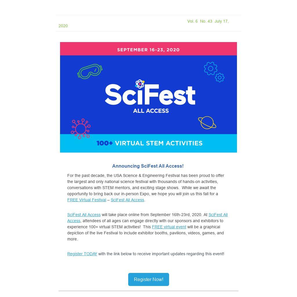 For the past decade, the USA Science & Engineering Festival has been proud to offer the largest and only national science festival with thousands of hands-on activities, conversations with STEM mentors, and exciting stage shows. While we await the opportunity to bring back our in-person Expo, we hope you will join us this fall for a FREE Virtual Festival – SciFest All Access.