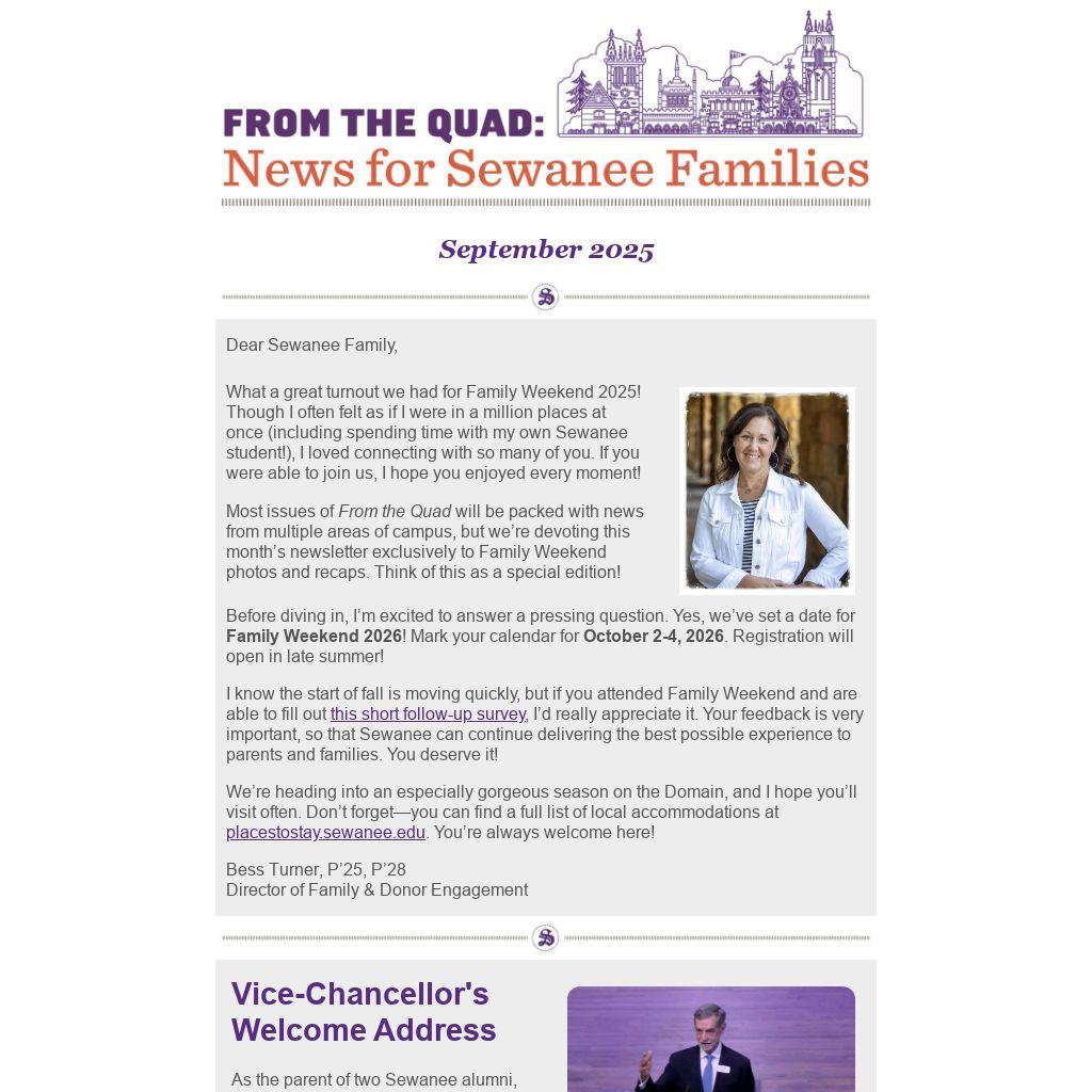 What a great turnout we had for Family Weekend 2025! Though I often felt as if I were in a million places at once (including spending time with my own Sewanee student!), I loved connecting with so many of you. If you were able to join us, I hope you enjoyed every moment!