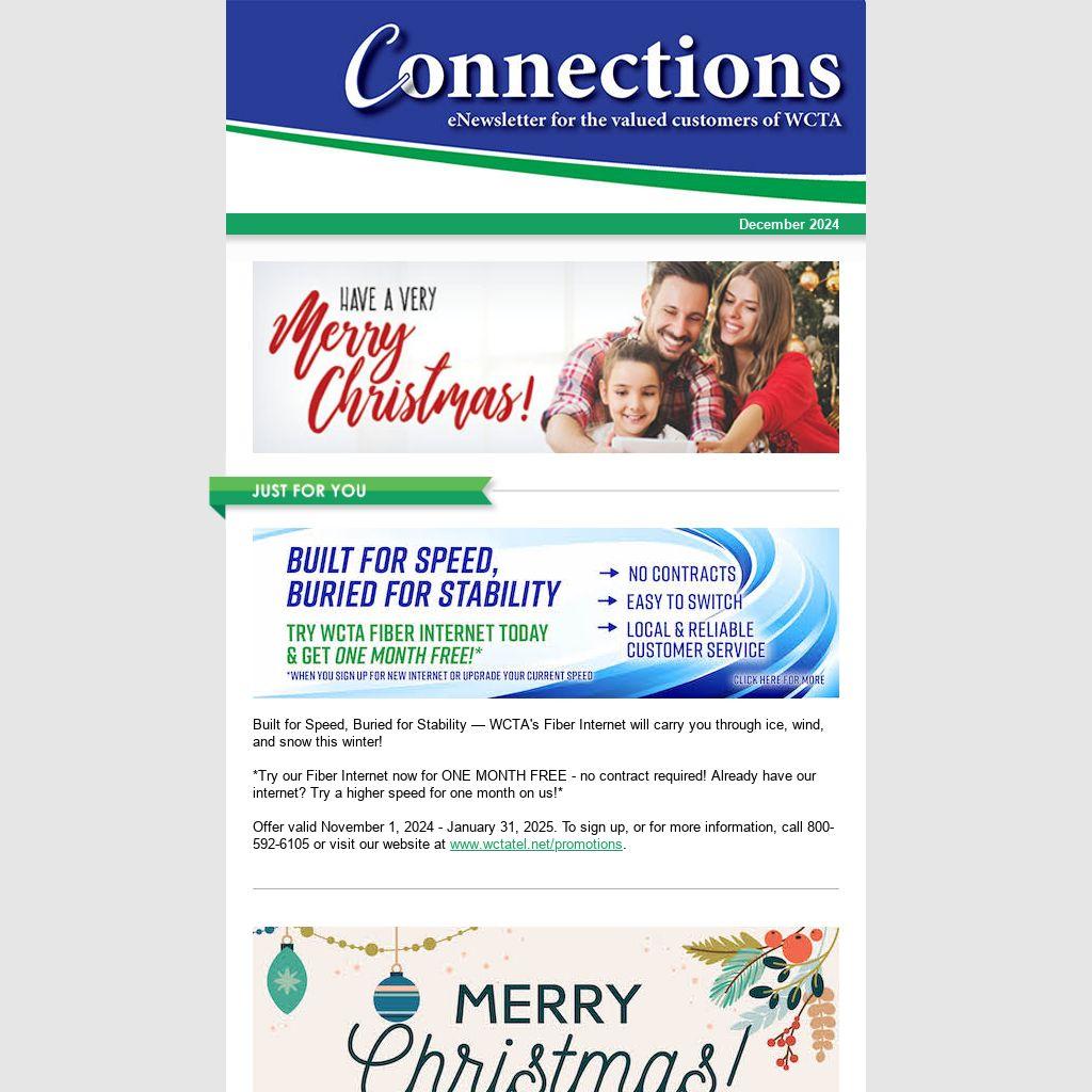 Built for Speed, Buried for Stability — WCTA's Fiber Internet will carry you through ice, wind, and snow this winter! *Try our Fiber Internet now for ONE MONTH FREE - no contract required! Already have our internet? Try a higher speed for one month on us!* Offer valid November 1, 2024 - January 31, 2025. To sign up, or for more information, call 800-592-6105 or visit our website at www.wctatel.net/promotions. ![]()