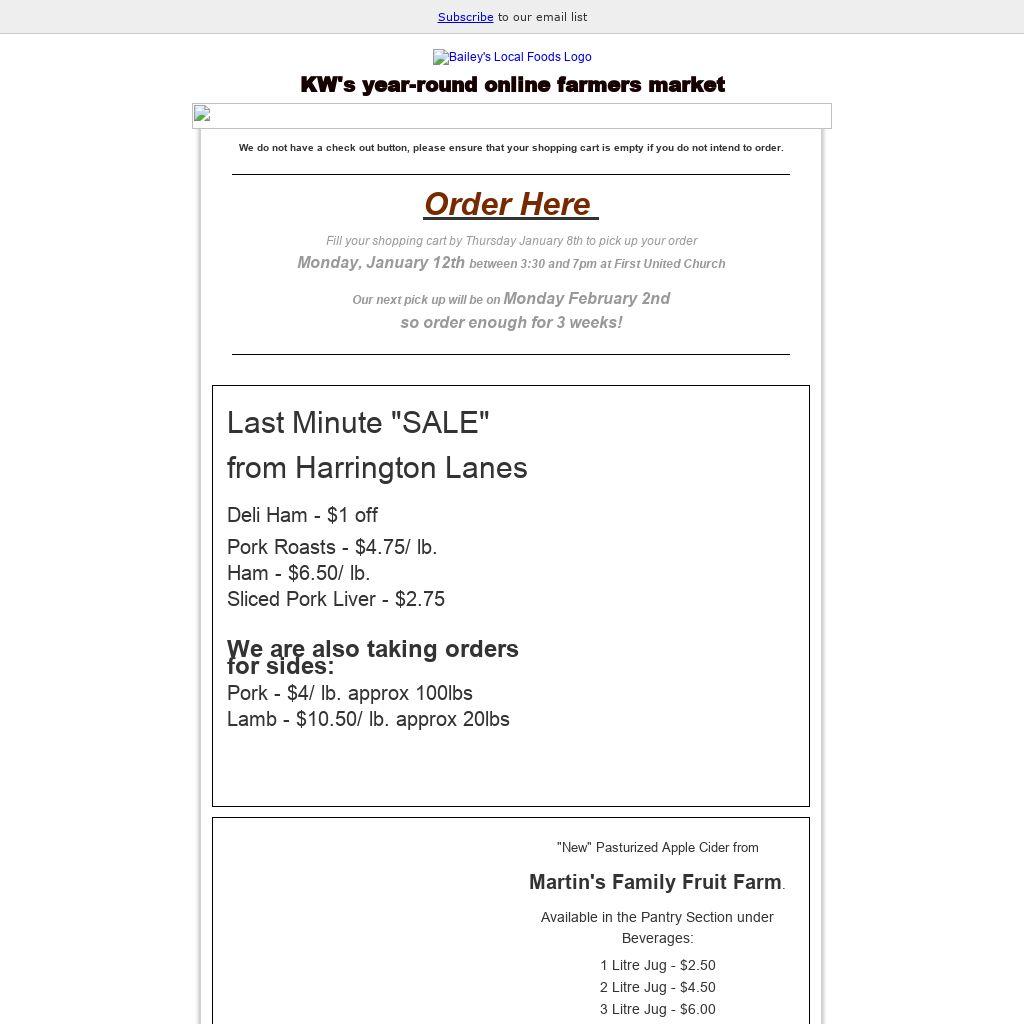 Our next pick up will be on Monday February 2nd so order enough for 3 weeks!