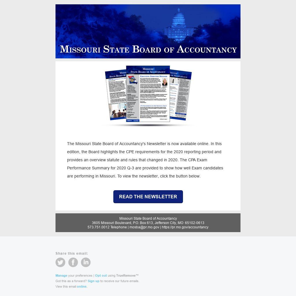The Missouri State Board of Accountancy's Newsletter is now available online. In this edition, the Board highlights the CPE requirements for the 2020 reporting period and provides an overview statute and rules that changed in 2020. The CPA Exam Performance Summary for 2020 Q-3 are provided to show how well Exam candidates are performing in Missouri. To view the newsletter, click the button below.
