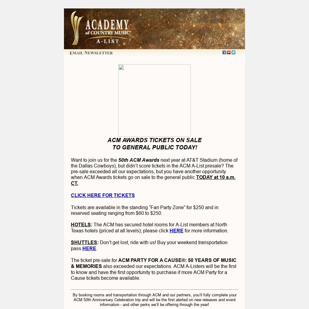 Want to join us for the 50th ACM Awards next year at AT&T Stadium (home of the Dallas Cowboys), but didn’t score tickets in the ACM A-List presale? The pre-sale exceeded all our expectations, but you have another opportunity when ACM Awards tickets go on sale to the general public TODAY at 10 a.m. CT.