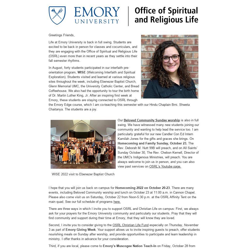 There are three ways in which I invite you to support OSRL and Christian Life on campus: First, we always ask for your prayers for the Emory University community and particularly our students. Pray that they will find community and support during their time at Emory, that they will know they are loved.