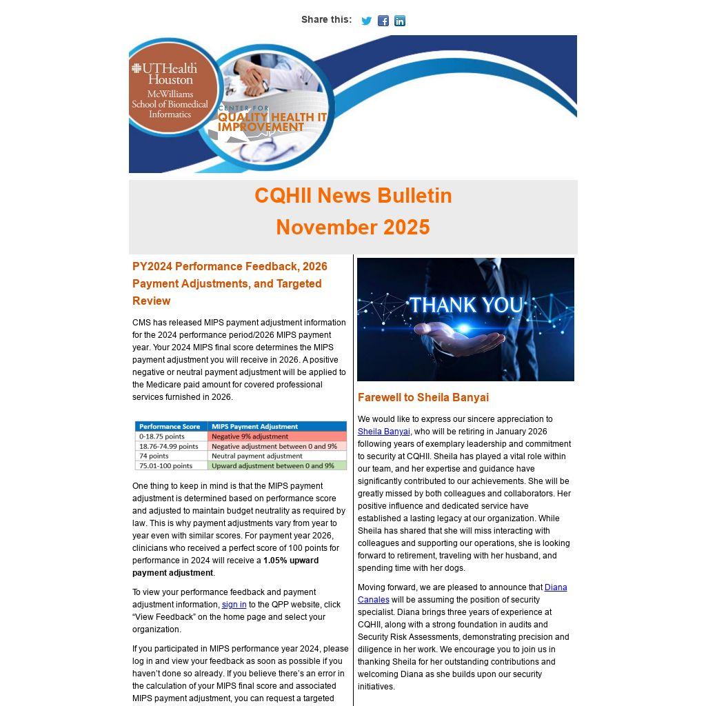 We would like to express our sincere appreciation to Sheila Banyai, who will be retiring in January 2026 following years of exemplary leadership and commitment to security at CQHII. Sheila has played a vital role within our team, and her expertise and guidance have significantly contributed to our achievements. She will be greatly missed by both colleagues and collaborators. Her positive influence and dedicated service have established a lasting legacy at our organization. While Sheila has shared that she will miss interacting with colleagues and supporting our operations, she is looking forward to retirement, traveling with her husband, and spending time with her dogs.