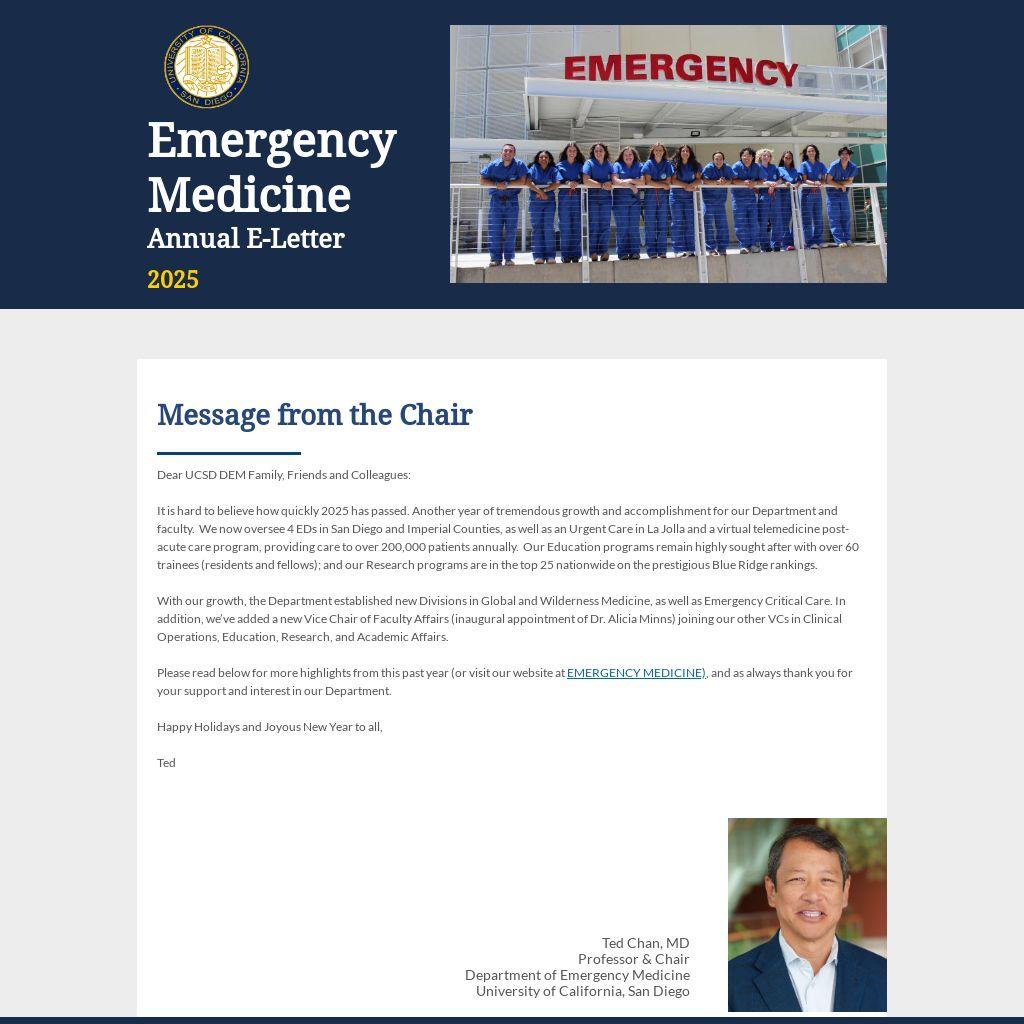 It is hard to believe how quickly 2025 has passed. Another year of tremendous growth and accomplishment for our Department and faculty. We now oversee 4 EDs in San Diego and Imperial Counties, as well as an Urgent Care in La Jolla and a virtual telemedicine post-acute care program, providing care to over 200,000 patients annually. Our Education programs remain highly sought after with over 60 trainees (residents and fellows); and our Research programs are in the top 25 nationwide on the prestigious Blue Ridge rankings.