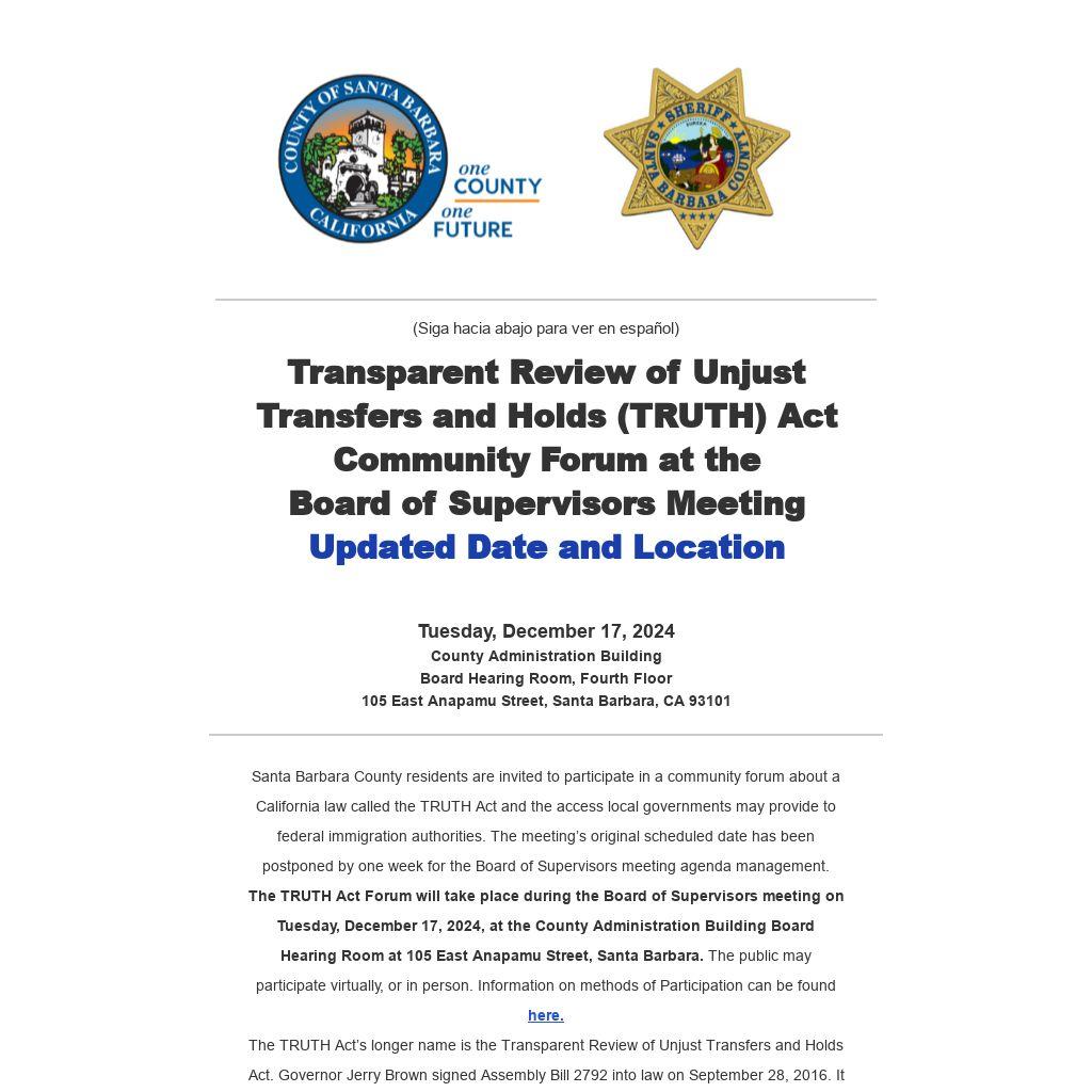 El Foro de la Ley TRUTH se llevará a cabo durante la reunión de la Junta de Supervisores el martes 17 de diciembre de 2024 en la Sala de Audiencias de la Junta del Edificio de la Administración del Condado, en 105 East Anapamu Street, Santa Barbara. El público puede participar virtualmente o en persona. La información sobre los métodos de participación se puede encontrar en línea. El nombre más largo de la Ley TRUTH es Ley de Revisión Transparente de Transferencias y Retenciones Injustas (Transparent Review of Unjust Transfers and Holds Act). El gobernador Jerry Brown firmó el Proyecto de Ley 2792 de la Asamblea el 28 de septiembre de 2016. Se refiere a la Agencia federal de Control de Inmigración y de Aduanas (ICE, por su término en inglés Immigration and Customs Enforcement) y el acceso para las personas que han estado en contacto con la policía. La Ley TRUTH requiere que los organismos gubernamentales locales, en los que las fuerzas policiales locales han proporcionado todo acceso a ICE a un individuo, celebren un foro comunitario para recibir y considerar comentarios públicos.