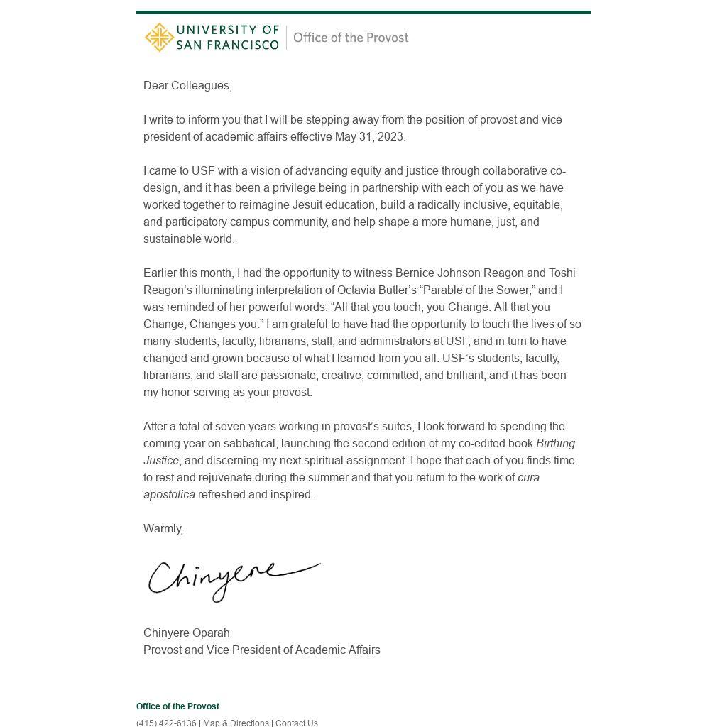 I came to USF with a vision of advancing equity and justice through collaborative co-design, and it has been a privilege being in partnership with each of you as we have worked together to reimagine Jesuit education, build a radically inclusive, equitable, and participatory campus community, and help shape a more humane, just, and sustainable world.