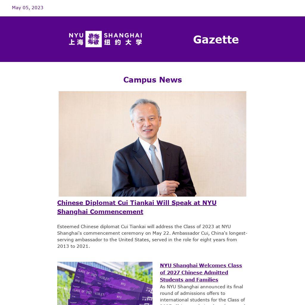 Esteemed Chinese diplomat Cui Tiankai will address the Class of 2023 at NYU Shanghai's commencement ceremony on May 22. Ambassador Cui, China's longest-serving ambassador to the United States, served in the role for eight years from 2013 to 2021.