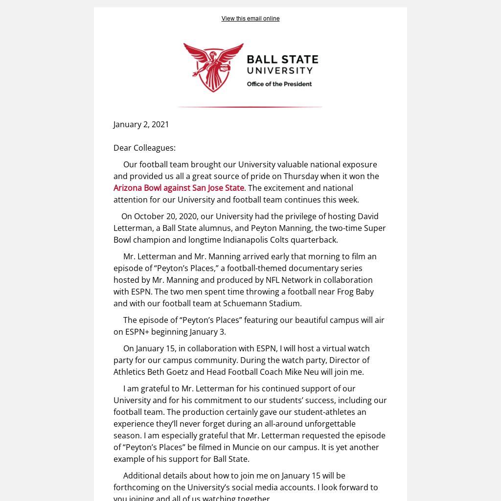 On October 20, 2020, our University had the privilege of hosting David Letterman, a Ball State alumnus, and Peyton Manning, the two-time Super Bowl champion and longtime Indianapolis Colts quarterback.