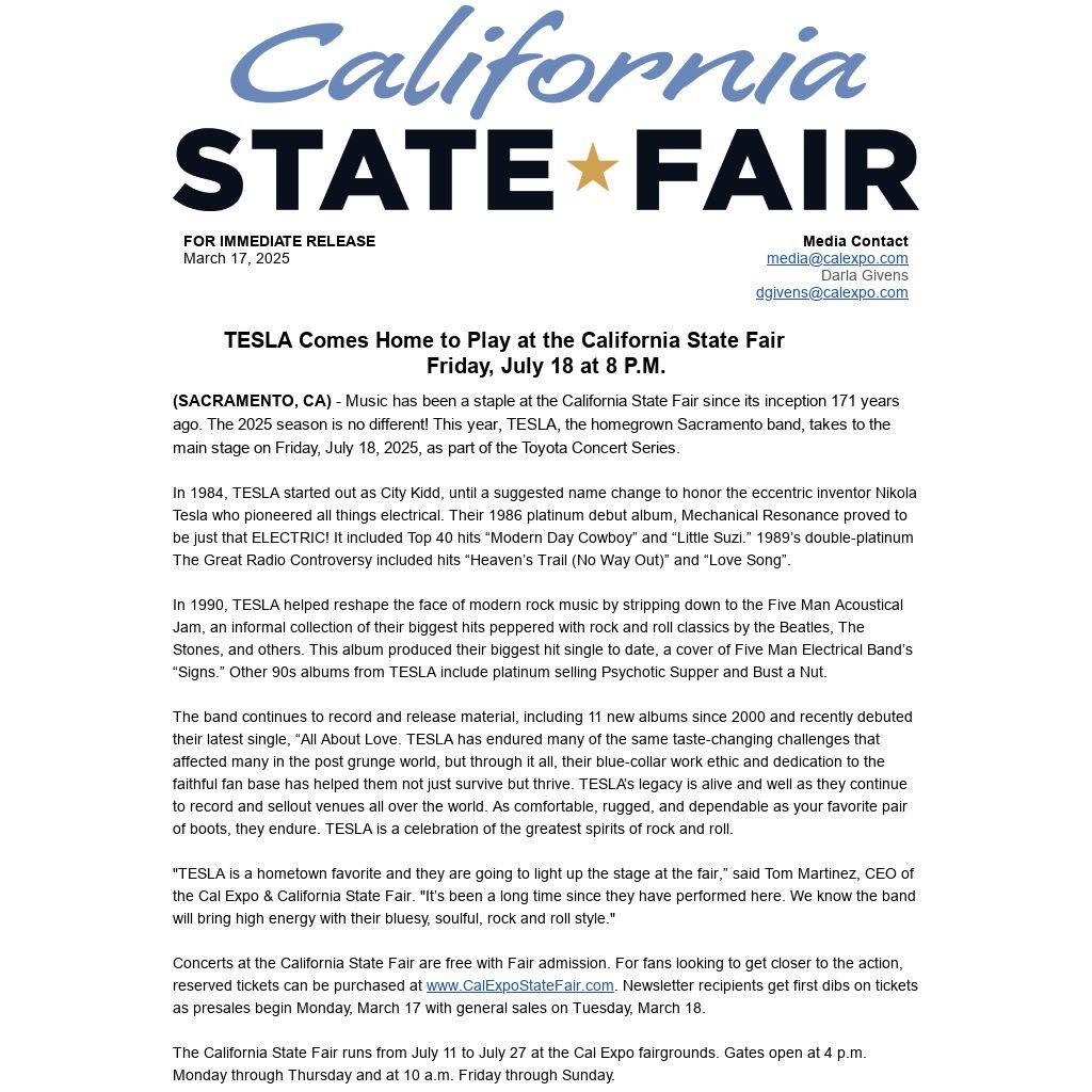 (SACRAMENTO, CA) - Music has been a staple at the California State Fair since its inception 171 years ago. The 2025 season is no different! This year, TESLA, the homegrown Sacramento band, takes to the main stage on Friday, July 18, 2025, as part of the Toyota Concert Series.