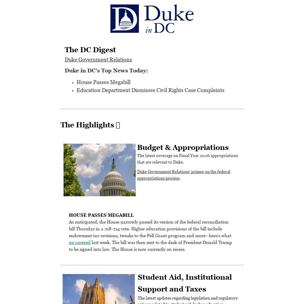 As anticipated, the House narrowly passed its version of the federal reconciliation bill Thursday in a 218-214 vote. Higher education provisions of the bill include endowment tax revisions, tweaks to the Pell Grant program and more--here's what we coveredlast week. The bill was then sent to the desk of President Donald Trump to be signed into law. The House is now currently on recess.