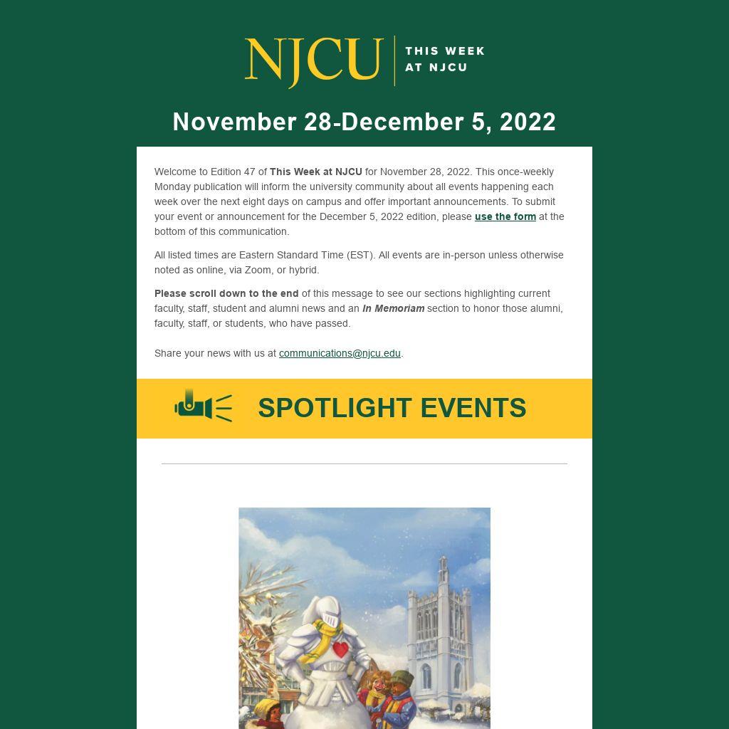 Welcome to Edition 47 of This Week at NJCU for November 28, 2022. This once-weekly Monday publication will inform the university community about all events happening each week over the next eight days on campus and offer important announcements. To submit your event or announcement for the December 5, 2022 edition, please use the form at the bottom of this communication.