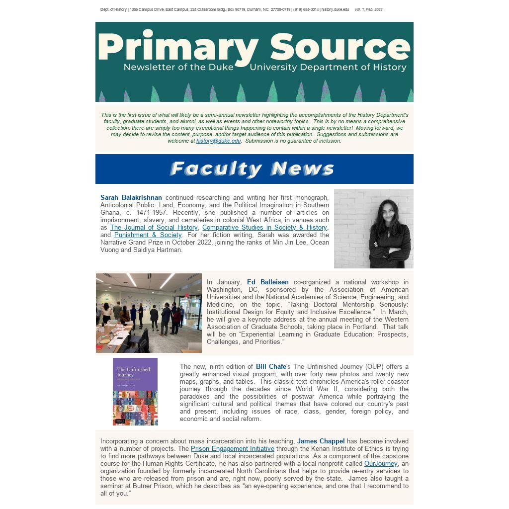 This is the first issue of what will likely be a semi-annual newsletter highlighting the accomplishments of the History Department's faculty, graduate students, and alumni, as well as events and other noteworthy topics. This is by no means a comprehensive collection; there are simply too many exceptional things happening to contain within a single newsletter! Moving forward, we may decide to revise the content, purpose, and/or target audience of this publication. Suggestions and submissions are welcome at history@duke.edu. Submission is no guarantee of inclusion.