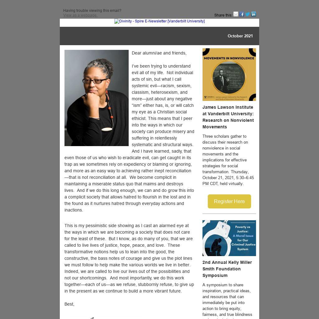 Dear alumni/ae and friends, I’ve been trying to understand evil all of my life. Not individual acts of sin, but what I call systemic evil—racism, sexism, classism, heterosexism, and more—just about any negative “ism” either has, is, or will catch my eye as a Christian social ethicist. This means that I peer into the ways in which our society can produce misery and suffering in relentlessly systematic and structural ways. And I have learned, sadly, that even those of us who wish to eradicate evil, can get caught in its trap as we sometimes rely on expediency or blaming or ignoring, and more as an easy way to achieving rather inept reconciliation—that is not reconciliation at all. We become complicit in maintaining a miserable status quo that maims and destroys lives. And if we do this long enough, we can and do grow this into a complicit society that allows hatred to flourish in the lost and in the found as it nurtures hatred through everyday actions and inactions.