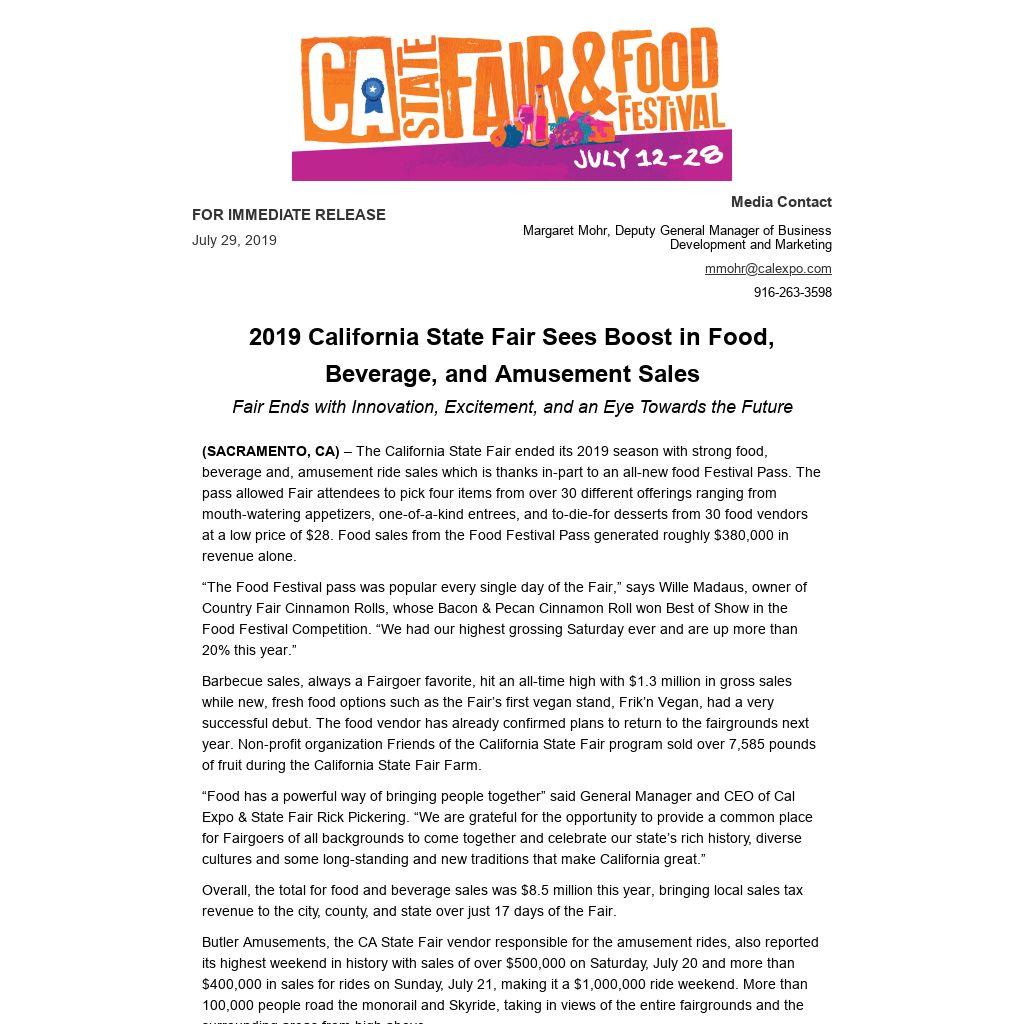 (SACRAMENTO, CA) – The California State Fair ended its 2019 season with strong food, beverage and, amusement ride sales which is thanks in-part to an all-new food Festival Pass. The pass allowed Fair attendees to pick four items from over 30 different offerings ranging from mouth-watering appetizers, one-of-a-kind entrees, and to-die-for desserts from 30 food vendors at a low price of $28. Food sales from the Food Festival Pass generated roughly $380,000 in revenue alone.