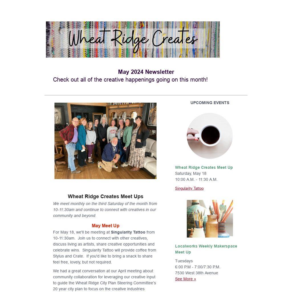 Wheat Ridge Creates Meet Ups We meet monthly on the third Saturday of the month from 10-11:30am and continue to connect with creatives in our community and beyond.