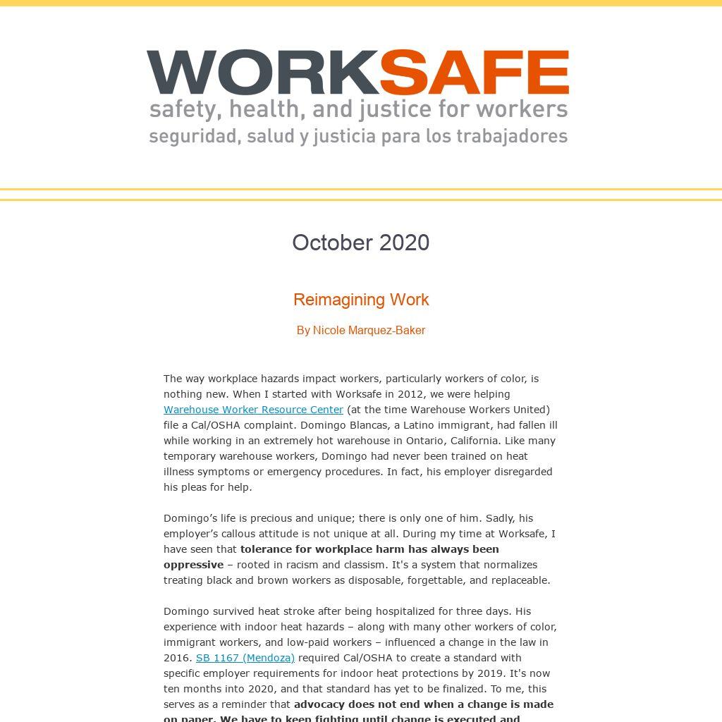 The way workplace hazards impact workers, particularly workers of color, is nothing new. When I started with Worksafe in 2012, we were helping Warehouse Worker Resource Center (at the time Warehouse Workers United) file a Cal/OSHA complaint. Domingo Blancas, a Latino immigrant, had fallen ill while working in an extremely hot warehouse in Ontario, California. Like many temporary warehouse workers, Domingo had never been trained on heat illness symptoms or emergency procedures. In fact, his employer disregarded his pleas for help. Domingo’s life is precious and unique; there is only one of him. Sadly, his employer’s callous attitude is not unique at all. During my time at Worksafe, I have seen that tolerance for workplace harm has always been oppressive – rooted in racism and classism. It's a system that normalizes treating black and brown workers as disposable, forgettable, and replaceable. Domingo survived heat stroke after being hospitalized for three days. His experience with indoor heat hazards – along with many other workers of color, immigrant workers, and low-paid workers – influenced a change in the law in 2016. SB 1167 (Mendoza) required Cal/OSHA to create a standard with specific employer requirements for indoor heat protections by 2019. It's now ten months into 2020, and that standard has yet to be finalized. To me, this serves as a reminder that advocacy does not end when a change is made on paper. We have to keep fighting until change is executed and enforced. Now, as I leave Worksafe, COVID-19 is highlighting just how dangerous work has always been for black and brown workers like Domingo. Some of these workers are still carved out of Cal/OSHA protections. This reality has catapulted us into reimagining our relationship with work. And workers are leading important changes – whether through legislative advocacy to gain Cal/OSHA coverage for domestic workers and day laborers or by pushing for stronger workplace protections from hazards like COVID-19. As I reflect on my time with Worksafe, I’m grateful for our successful advocacy on behalf of folks like Domingo. As a woman of color, I take great pride in being able to serve as conduit for my community. I’m filled with a great sense of appreciation for this work and a great sense of responsibility to keep moving the dial towards justice. Together, we can change this paradigm. Justice is not self-executing, justice takes work! Adelante! Nicole