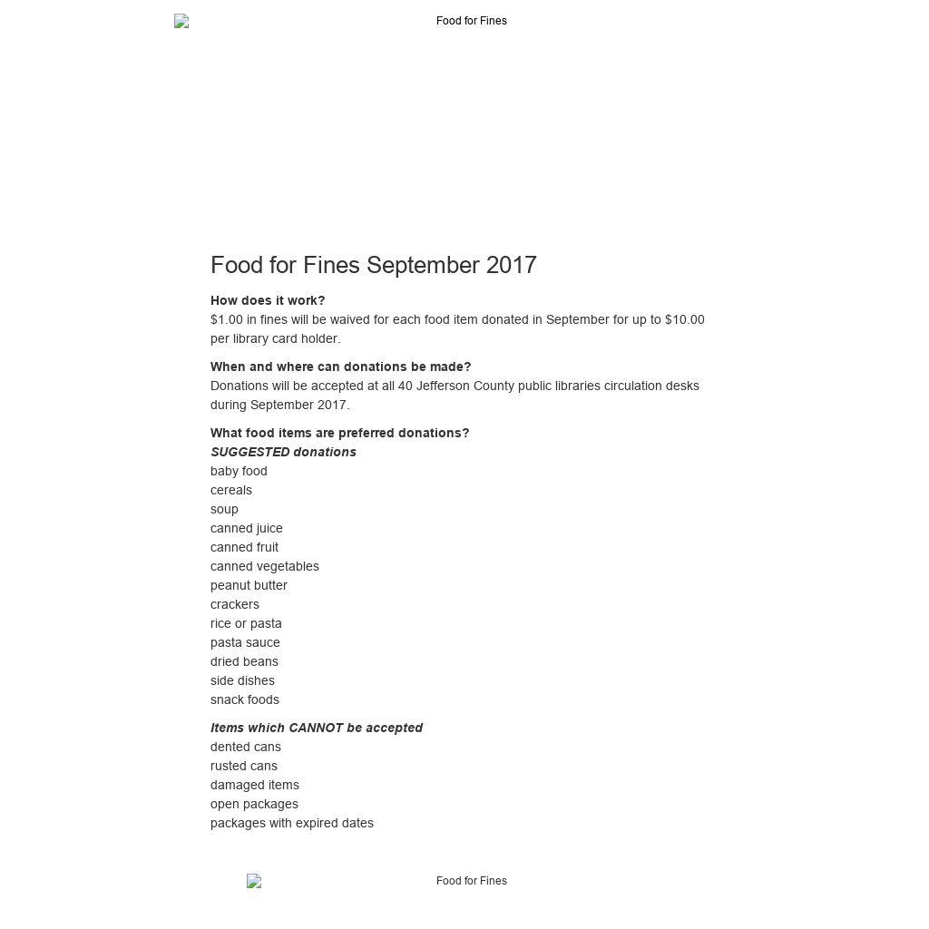 $1.00 in fines will be waived for each food item donated in September for up to $10.00 per library card holder.
