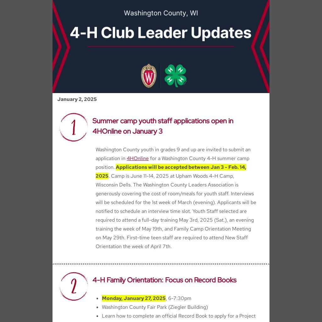 Washington County youth in grades 9 and up are invited to submit an application in 4HOnline for a Washington County 4-H summer camp position. Applications will be accepted between Jan 3 - Feb. 14, 2025. Camp is June 11-14, 2025 at Upham Woods 4-H Camp, Wisconsin Dells. The Washington County Leaders Association is generously covering the cost of room/meals for youth staff. Interviews will be scheduled for the 1st week of March (evening). Applicants will be notified to schedule an interview time slot. Youth Staff selected are required to attend a full-day training May 3rd, 2025 (Sat.), an evening training the week of May 19th, and Family Camp Orientation Meeting on May 29th. First-time teen staff are required to attend New Staff Orientation the week of April 7th.
