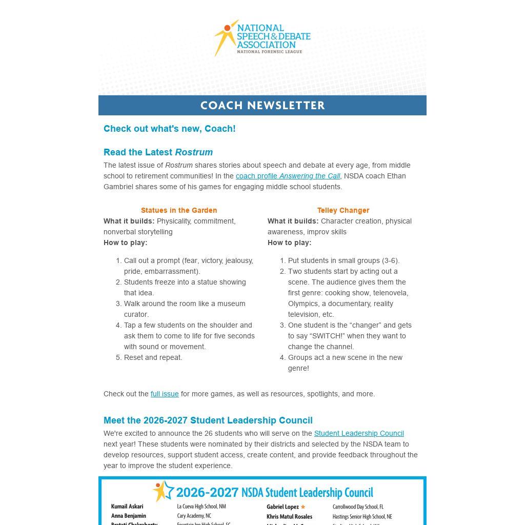 The latest issue of Rostrum shares stories about speech and debate at every age, from middle school to retirement communities! In the coach profile Answering the Call, NSDA coach Ethan Gambriel shares some of his games for engaging middle school students.