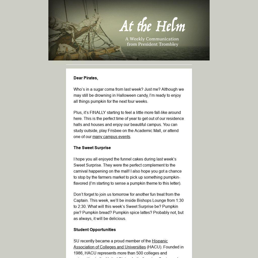 Don’t forget to join us tomorrow for another fun treat from the Captain. This week, we’ll be inside Bishops Lounge from 1:30 to 2:30. What will this week’s Sweet Surprise be? Pumpkin pie? Pumpkin bread? Pumpkin spice lattes? Probably not, but as always, it will be delicious.