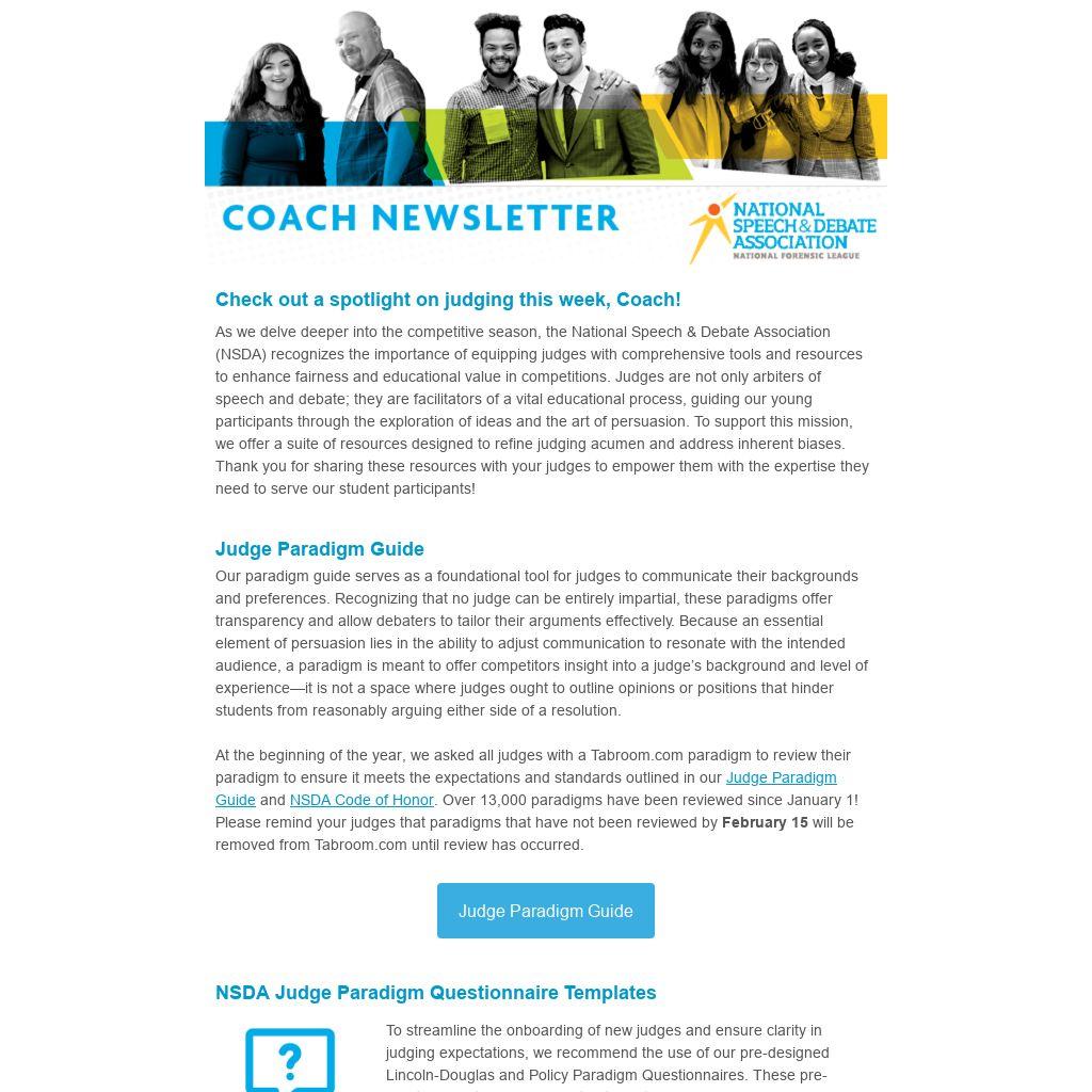 At the beginning of the year, we asked all judges with a Tabroom.com paradigm to review their paradigm to ensure it meets the expectations and standards outlined in our Judge Paradigm Guide and NSDA Code of Honor. Over 13,000 paradigms have been reviewed since January 1! Please remind your judges that paradigms that have not been reviewed by February 15 will be removed from Tabroom.com until review has occurred.
