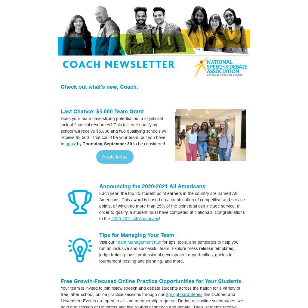 Tips for Managing Your TeamVisit our Team Management hub for tips, tools, and templates to help you run an inclusive and successful team! Explore press release templates, judge training tools, professional development opportunities, guides to tournament hosting and planning, and more.