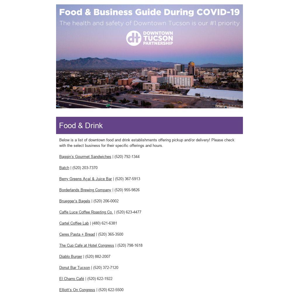 Below is a list of downtown food and drink establishments offering pickup and/or delivery! Please check with the select business for their specific offerings and hours.