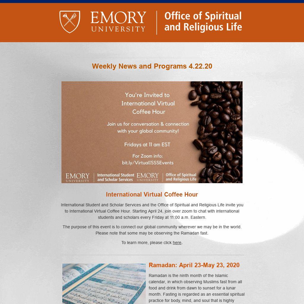 Emory OSRL Enews is published weekly during term by the Emory University Office of Spiritual and Religious Life covering Atlanta-campus programs. For Oxford College spiritual life, please click here. To submit information or to update your preferences, please contact religiouslife@emory.edu.