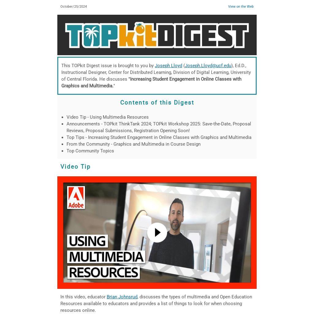 This TOPkit Digest issue is brought to you by Joseph Lloyd (Joseph.Lloyd@ucf.edu), Ed.D., Instructional Designer, Center for Distributed Learning, Division of Digital Learning, University of Central Florida. He discusses "Increasing Student Engagement in Online Classes with Graphics and Multimedia."