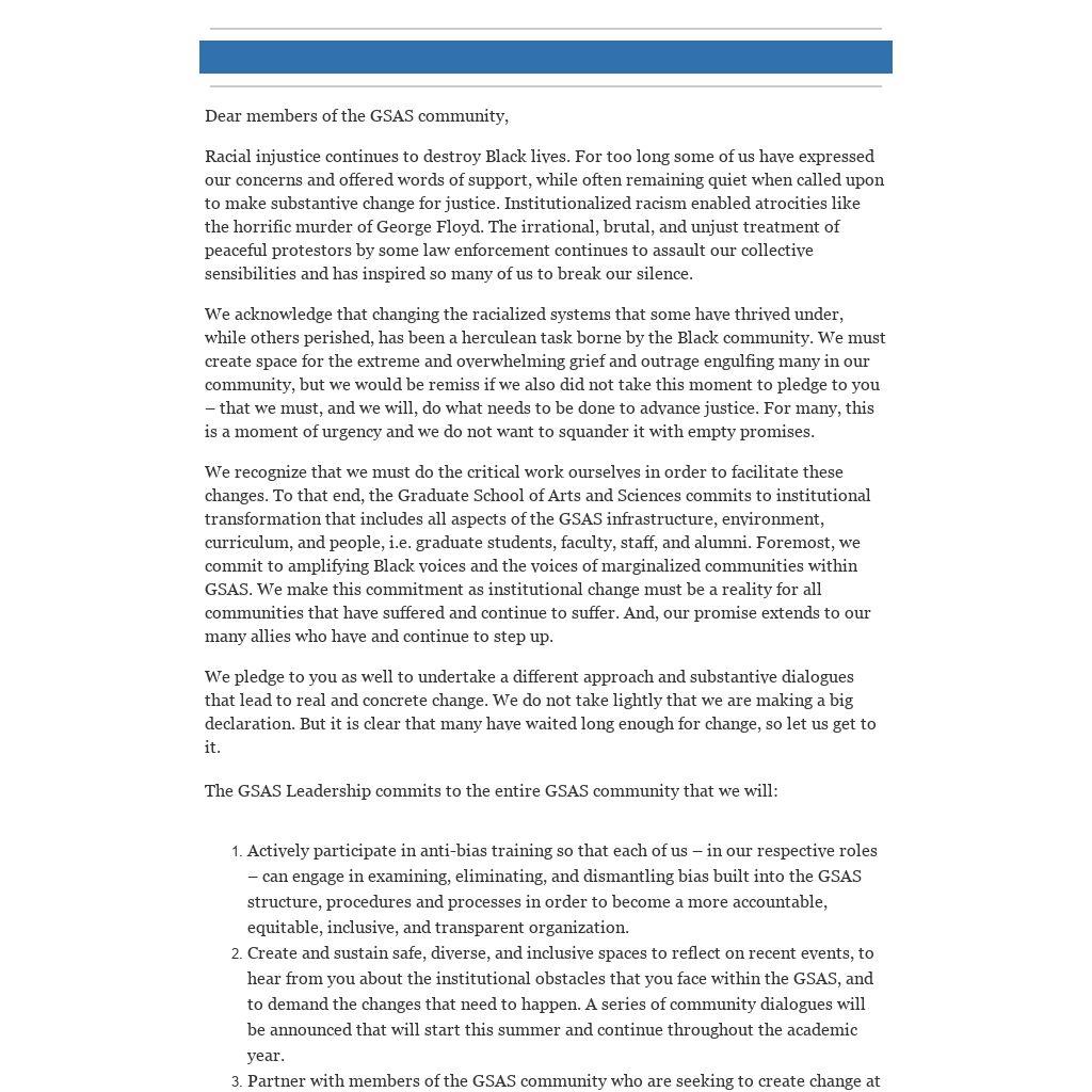 We recognize that we must do the critical work ourselves in order to facilitate these changes. To that end, the Graduate School of Arts and Sciences commits to institutional transformation that includes all aspects of the GSAS infrastructure, environment, curriculum, and people, i.e. graduate students, faculty, staff, and alumni. Foremost, we commit to amplifying Black voices and the voices of marginalized communities within GSAS. We make this commitment as institutional change must be a reality for all communities that have suffered and continue to suffer. And, our promise extends to our many allies who have and continue to step up.