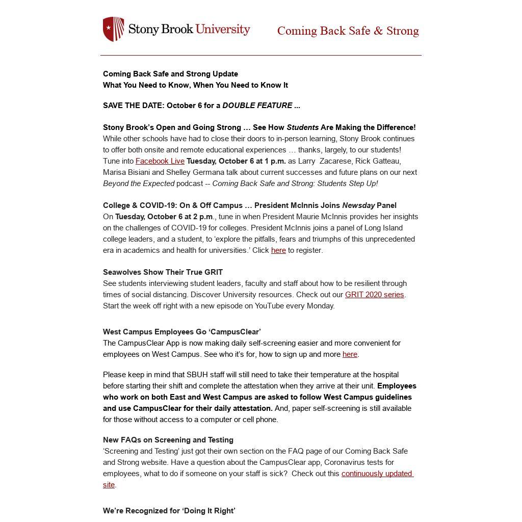 With a healthy start to Fall 2020, SBU is looking to continue to provide a safe, healthy campus environment this Spring. HR sent a comprehensive email on October 1 -- with everything from campus resources for COVID-19 health and safety, to COVID-19 testing, to telecommuting exemptions and the COVID-19 Telephone Information Line. Take a look if you haven’t … or a closer one … for all the details.