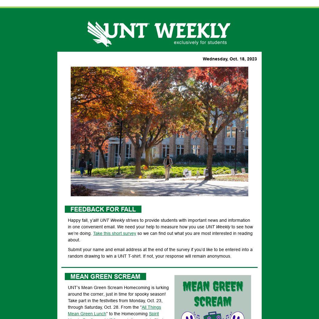 Happy fall, y’all! UNT Weekly strives to provide students with important news and information in one convenient email. We need your help to measure how you use UNT Weekly to see how we’re doing. Take this short survey so we can find out what you are most interested in reading about.
