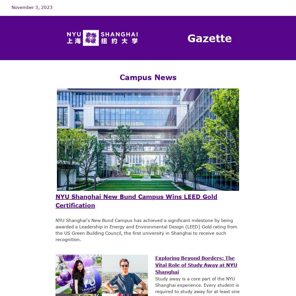 NYU Shanghai's New Bund Campus has achieved a significant milestone by being awarded a Leadership in Energy and Environmental Design (LEED) Gold rating from the US Green Building Council, the first university in Shanghai to receive such recognition.