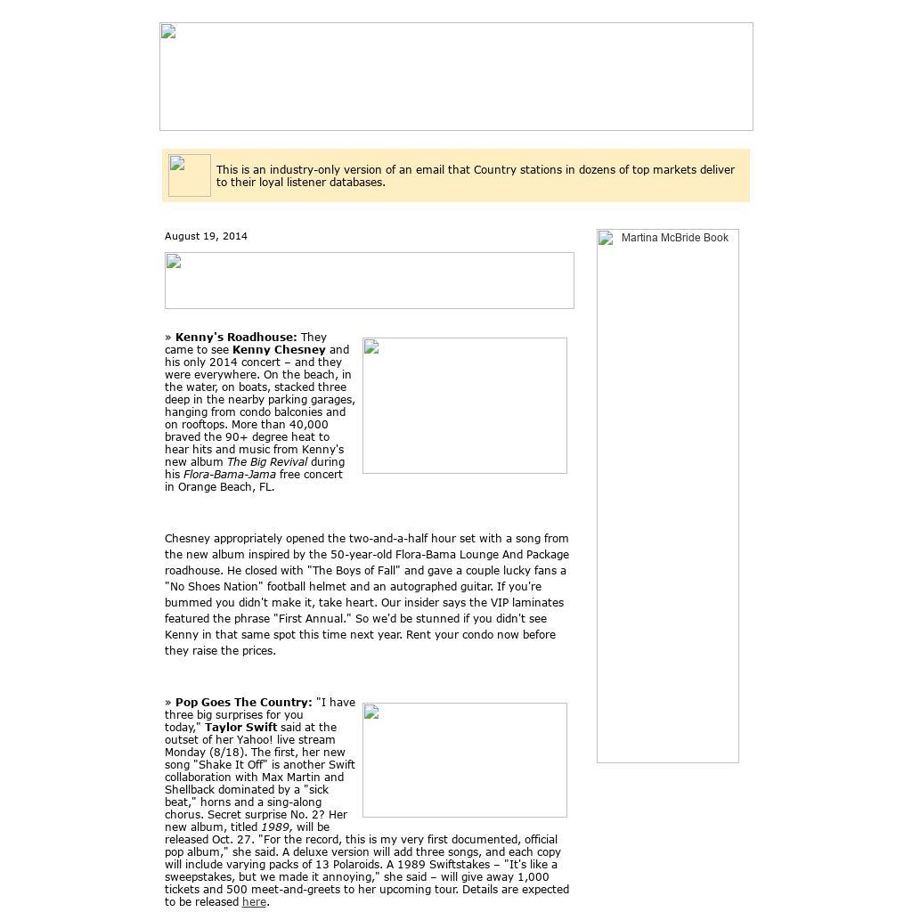 | This is an industry-only version of an email that Country stations in dozens of top markets deliver