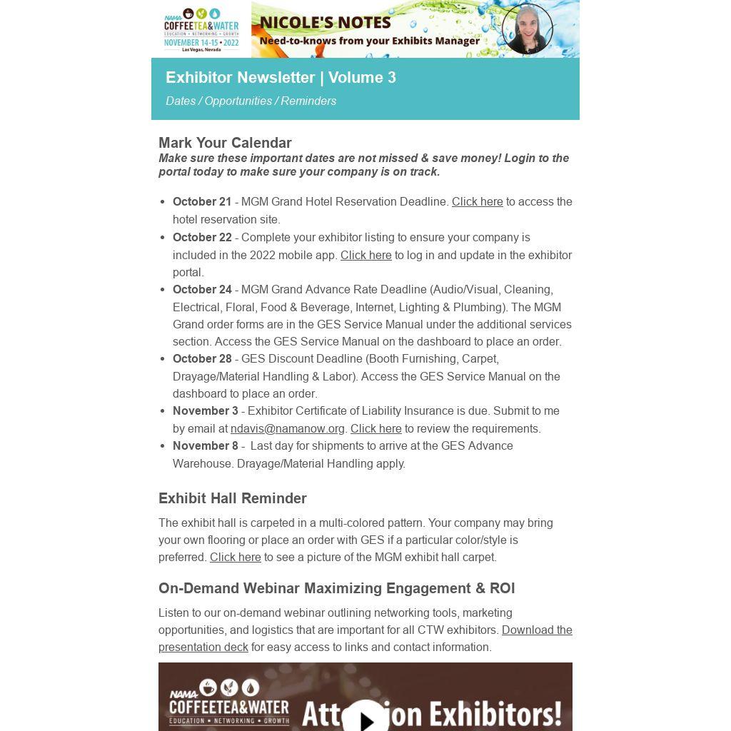 Exhibitor Newsletter | Volume 3 Dates / Opportunities / Reminders
