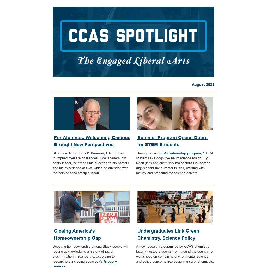 Read about CCAS students, faculty and alumni who are making an impact in the classroom and around the world. For a print copy of the magazine, contact ccasnews@gwu.edu.