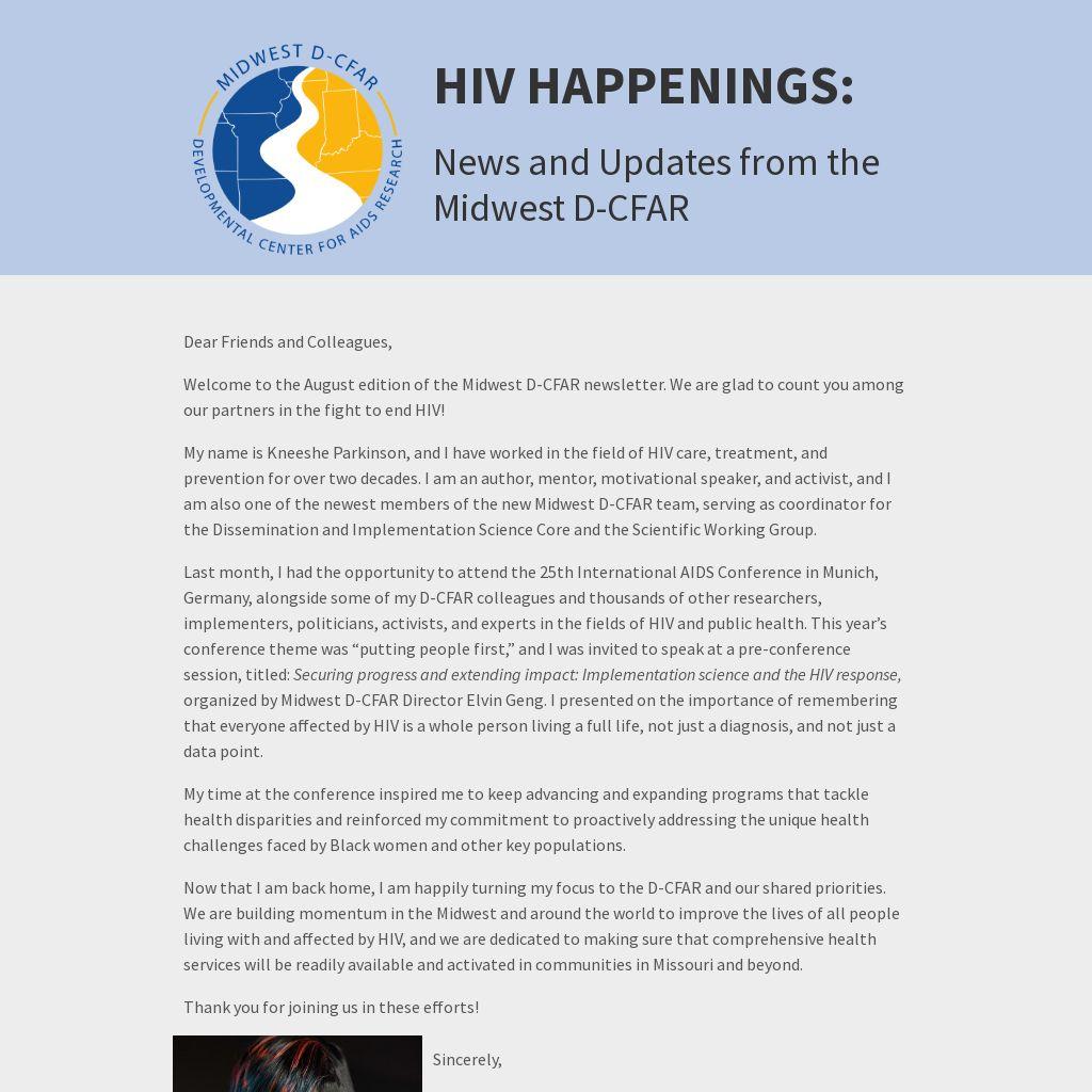 Welcome to the August edition of the Midwest D-CFAR newsletter. We are glad to count you among our partners in the fight to end HIV!