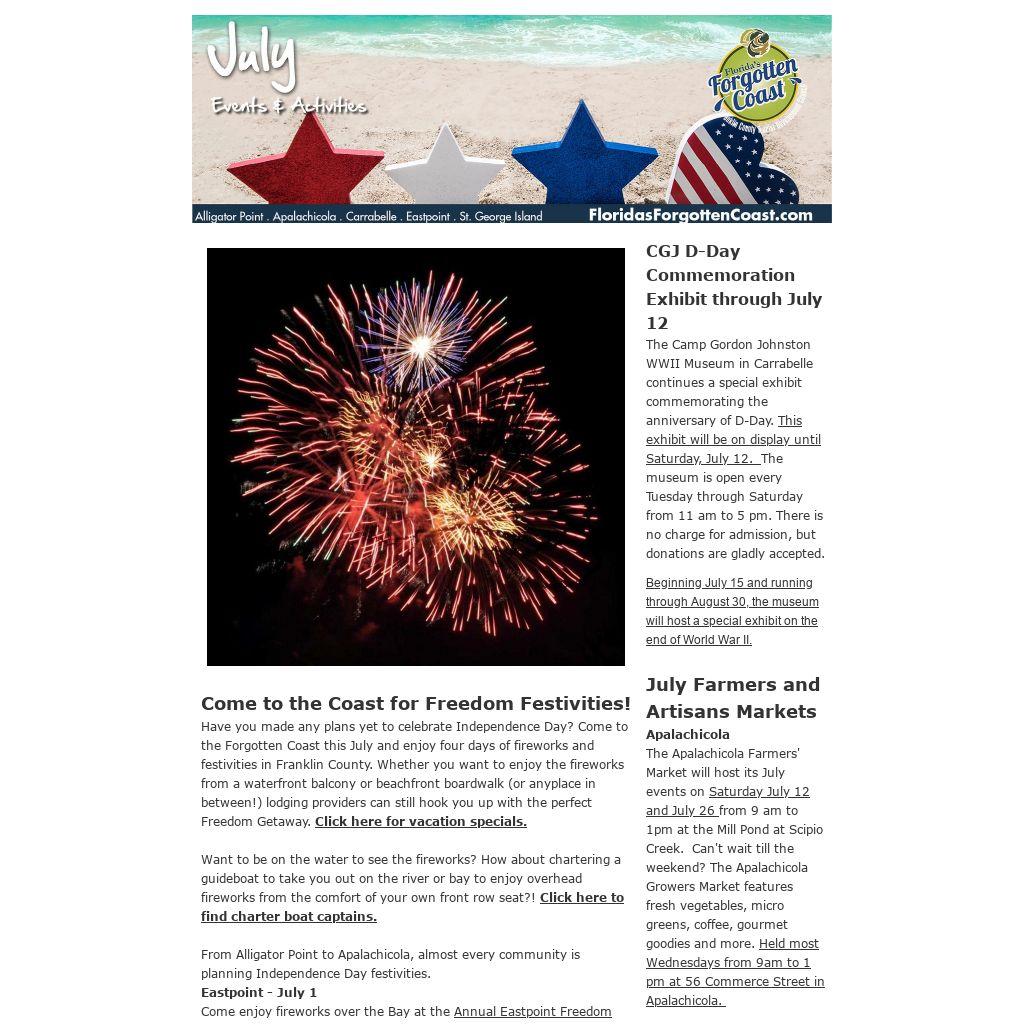Have you made any plans yet to celebrate Independence Day? Come to the Forgotten Coast this July and enjoy four days of fireworks and festivities in Franklin County. Whether you want to enjoy the fireworks from a waterfront balcony or beachfront boardwalk (or anyplace in between!) lodging providers can still hook you up with the perfect Freedom Getaway. Click here for vacation specials.
