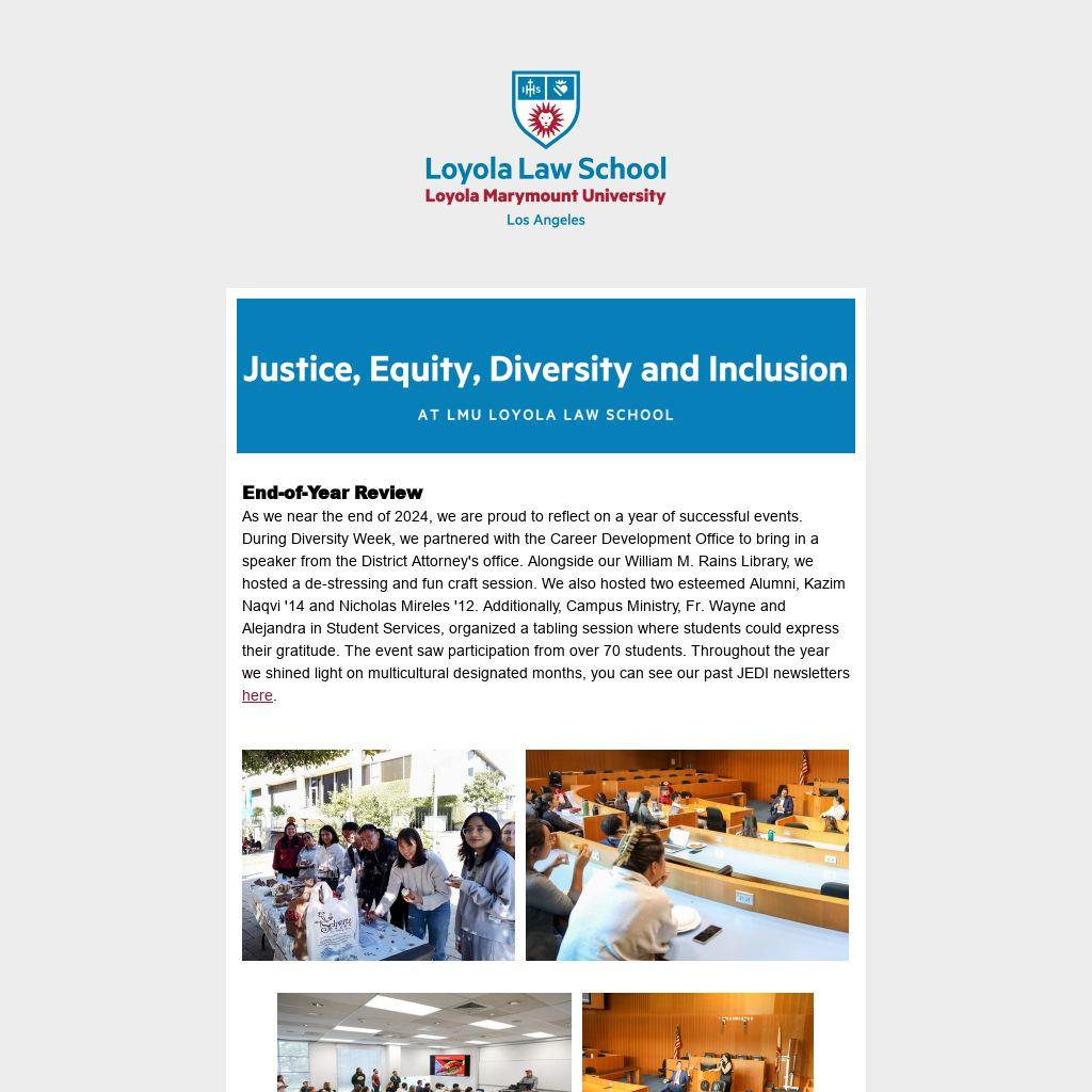 As we near the end of 2024, we are proud to reflect on a year of successful events. During Diversity Week, we partnered with the Career Development Office to bring in a speaker from the District Attorney's office. Alongside our William M. Rains Library, we hosted a de-stressing and fun craft session. We also hosted two esteemed Alumni, Kazim Naqvi '14 and Nicholas Mireles '12. Additionally, Campus Ministry, Fr. Wayne and Alejandra in Student Services, organized a tabling session where students could express their gratitude. The event saw participation from over 70 students. Throughout the year we shined light on multicultural designated months, you can see our past JEDI newsletters here.