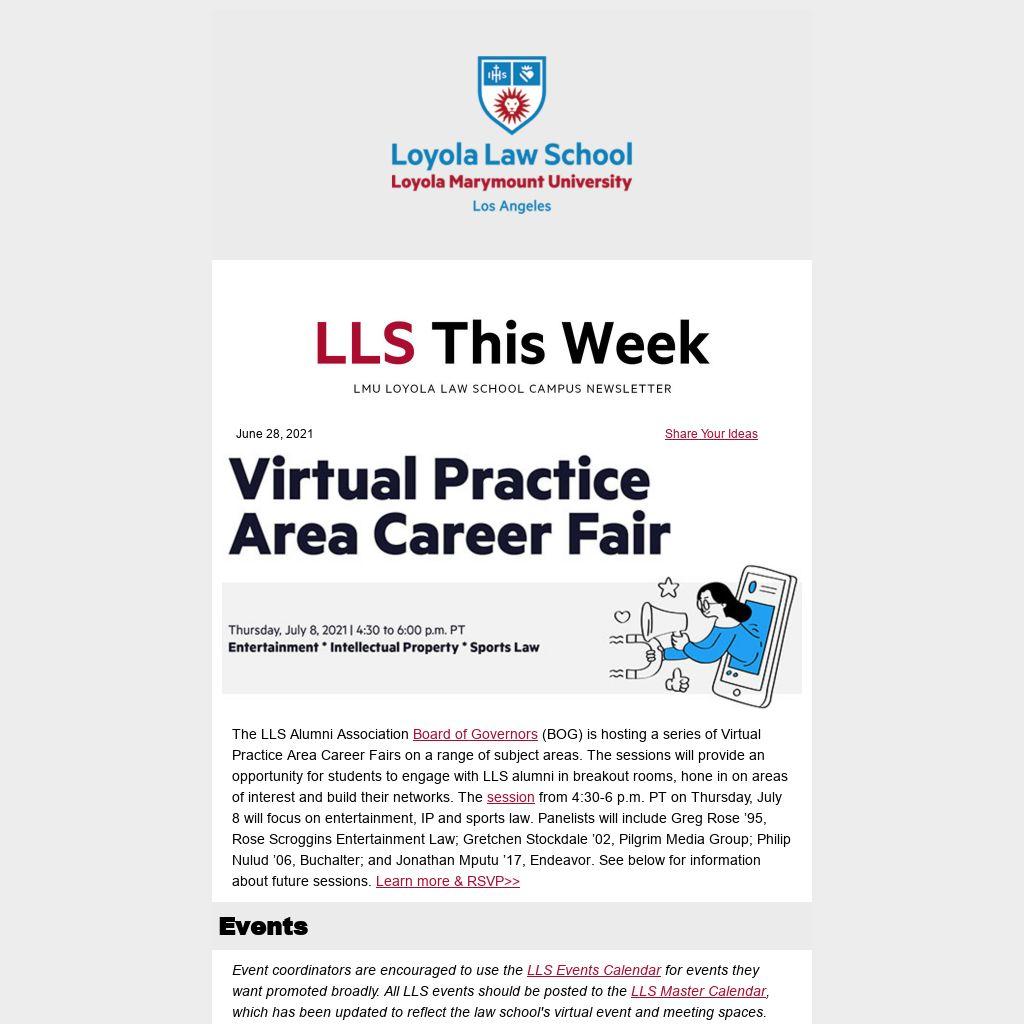 The LLS Alumni Association Board of Governors (BOG) is hosting a series of Virtual Practice Area Career Fairs on a range of subject areas. The sessions will provide an opportunity for students to engage with LLS alumni in breakout rooms, hone in on areas of interest and build their networks. The session from 4:30-6 p.m. PT on Thursday, July 8 will focus on entertainment, IP and sports law. Panelists will include Greg Rose ’95, Rose Scroggins Entertainment Law; Gretchen Stockdale ’02, Pilgrim Media Group; Philip Nulud ’06, Buchalter; and Jonathan Mputu ’17, Endeavor. See below for information about future sessions. Learn more & RSVP>>