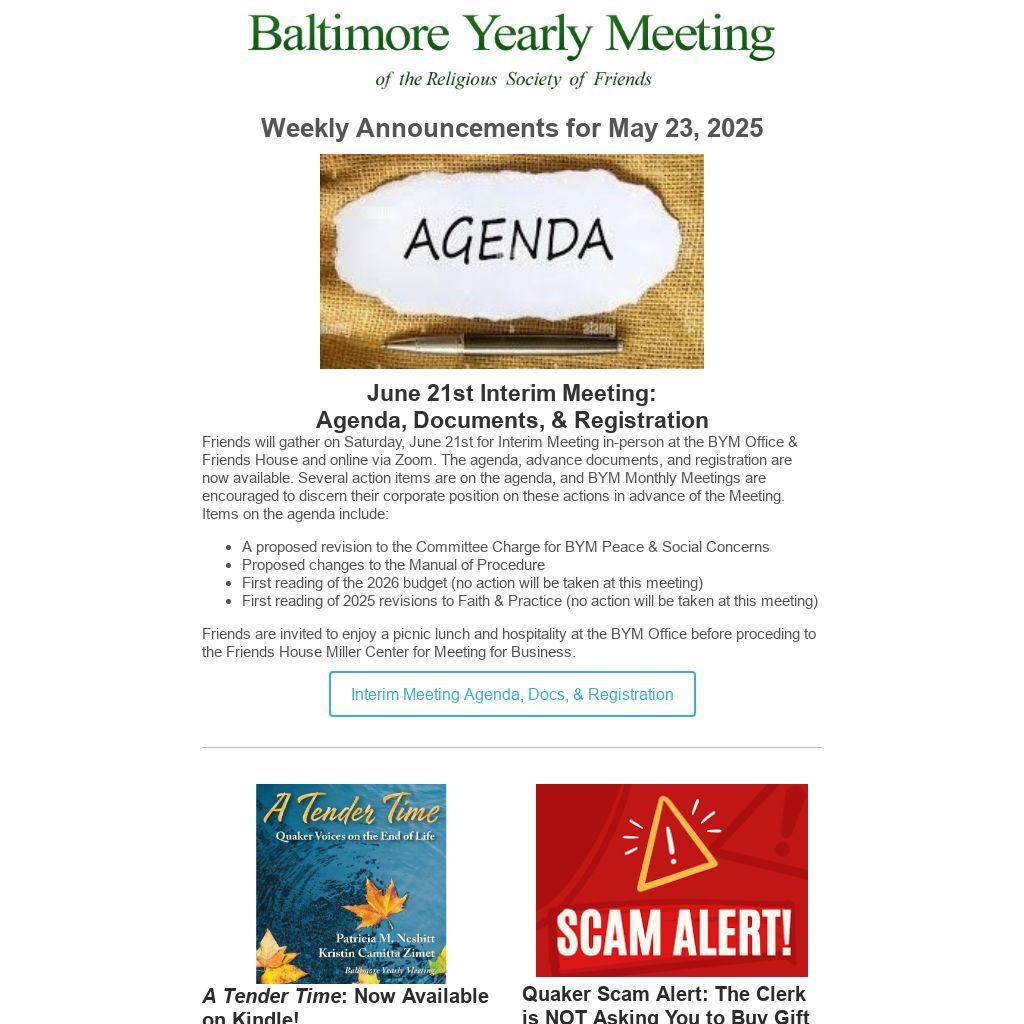 Friends will gather on Saturday, June 21st for Interim Meeting in-person at the BYM Office & Friends House and online via Zoom. The agenda, advance documents, and registration are now available. Several action items are on the agenda, and BYM Monthly Meetings are encouraged to discern their corporate position on these actions in advance of the Meeting. Items on the agenda include: