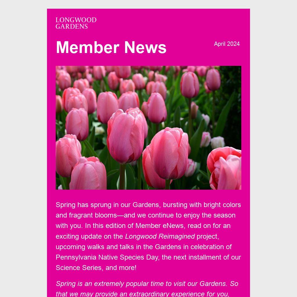 Spring has sprung in our Gardens, bursting with bright colors and fragrant blooms—and we continue to enjoy the season with you. In this edition of Member eNews, read on for an exciting update on the Longwood Reimagined project, upcoming walks and talks in the Gardens in celebration of Pennsylvania Native Species Day, the next installment of our Science Series, and more!