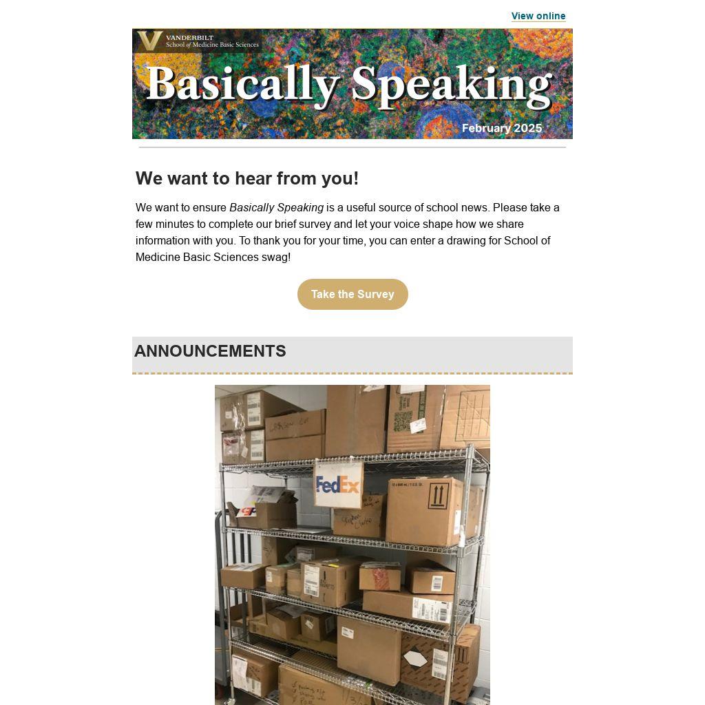 We want to ensure Basically Speaking is a useful source of school news. Please take a few minutes to complete our brief survey and let your voice shape how we share information with you. To thank you for your time, you can enter a drawing for School of Medicine Basic Sciences swag!