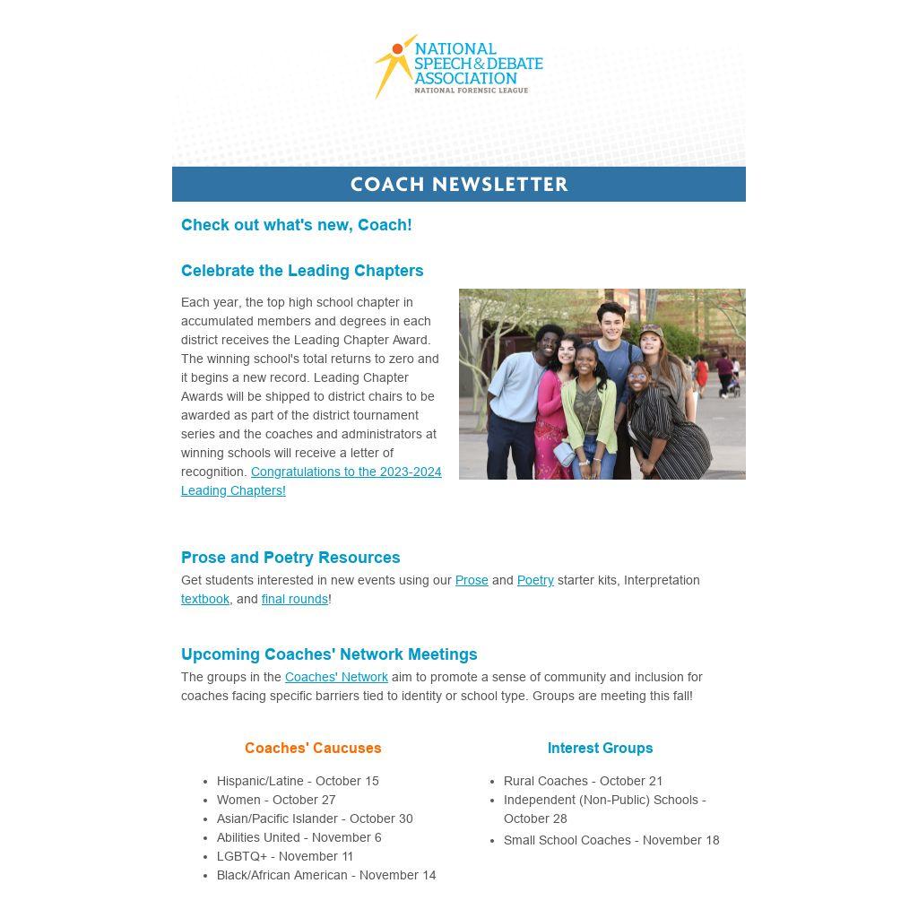 The groups in the Coaches' Network aim to promote a sense of community and inclusion for coaches facing specific barriers tied to identity or school type. Groups are meeting this fall!