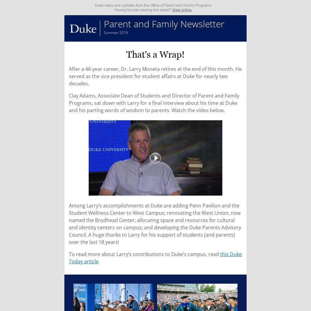 With the graduation of the Class of 2019, our Class of 2019 parents and families will also graduate from our associated Duke Facebook group. The official group will close at the end of July so that Duke personnel can transition their support to families of the incoming class. We sincerely thank Penny Fleming, Dana Williams Dudley, and Beth Gabay for their time and dedication to moderating this Facebook group.