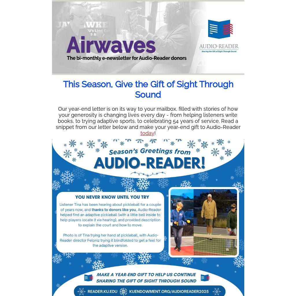 Our year-end letter is on its way to your mailbox, filled with stories of how your generosity is changing lives every day - from helping listeners write books, to trying adaptive sports, to celebrating 54 years of service. Read a snippet from our letter below and make your year-end gift to Audio-Reader today!